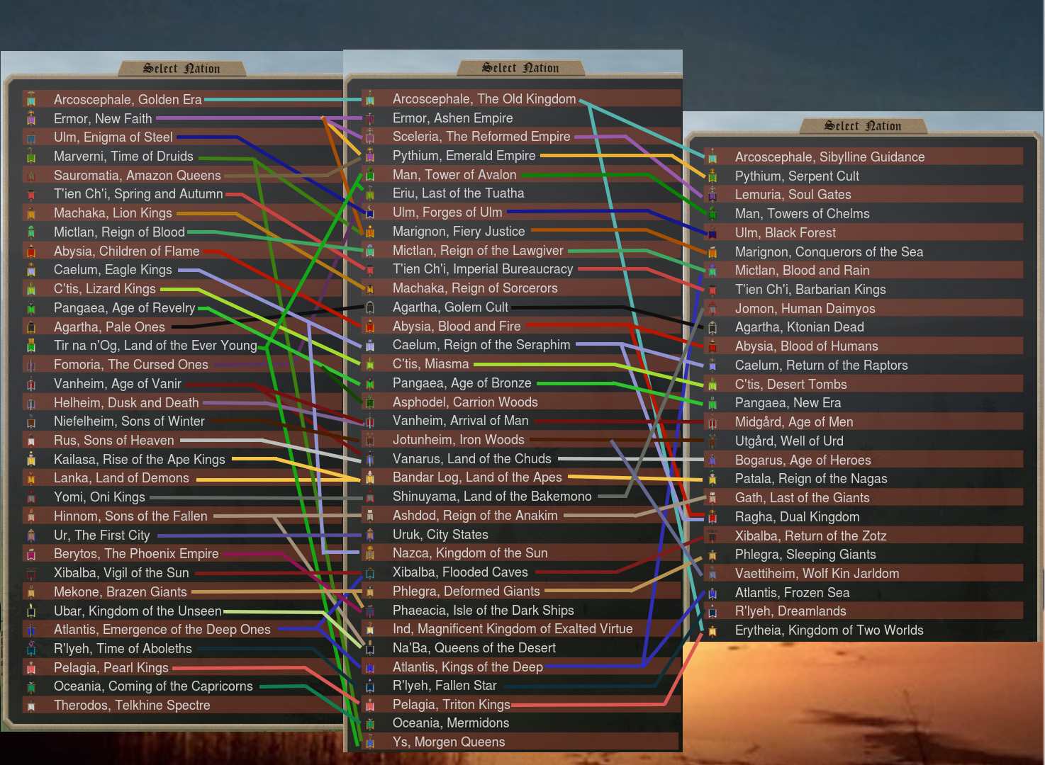 Closely related are amphibious nations - these start on land, but have special recruitment options in underwater fortresses. Most underwater nations have either disappeared or been driven onto land by R'lyeh in the Late Era.