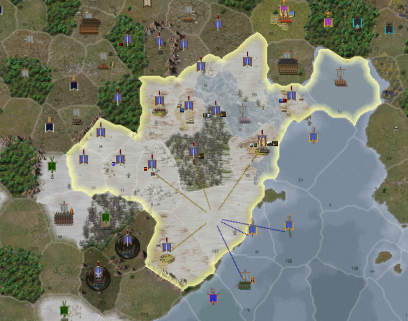 Despite some rivers that just would not freeze and a bit of backtracking because of low-connection provinces in the south by turn 12 I had 21 provinces.